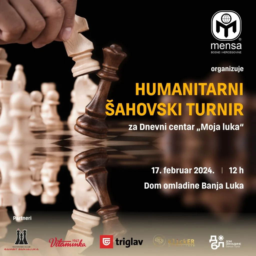 Mensa Bosne i Hercegovine organizuje humanitarni šahovski turnir u subotu, 17. februara 2024. godine, u Domu omladine u Banjoj Luci.