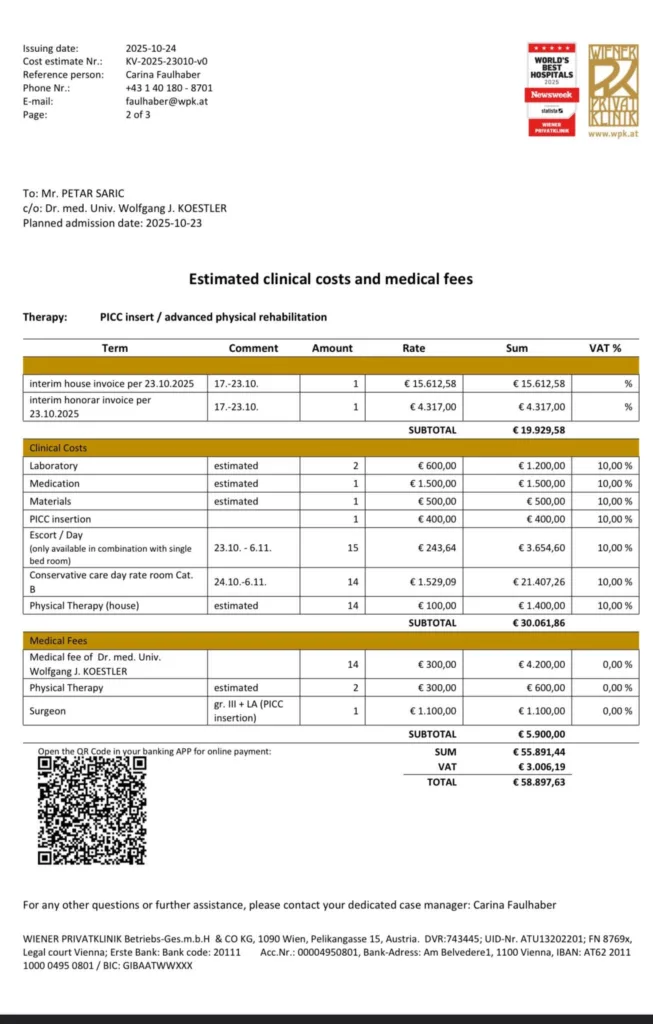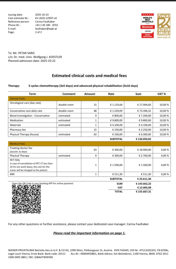 Bolnica nam je dostavila ponudu od 7. novembra 2025., kojom su obuhvaćene tri ciklusa hemoterapije, bolničko liječenje i rehabilitacija, u ukupnom iznosu od 155.667,31 eura.