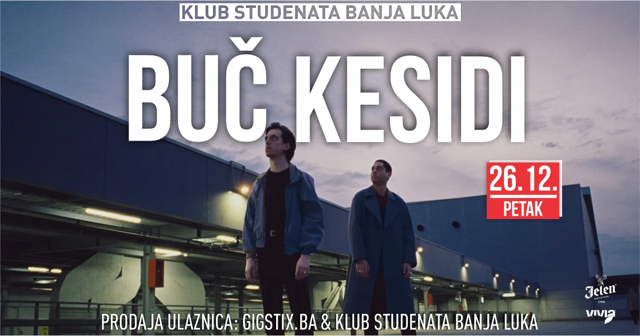 Samo šest dana kasnije, 26. decembra, pozornicu će preuzeti Buč Kesidi, jedan od najpopularnijih i najtraženijih bendova mlađe generacije. Duo iz Pančeva donosi prepoznatljivu kombinaciju elektronskog popa, groove ritmova i zarazne energije koja ih je lansirala u sam vrh regionalne muzičke scene. Njihovi nastupi su uvijek pažljivo producirani i pretvaraju se u pravi audiovizuelni doživljaj, pa se i ovaj koncert s nestrpljenjem očekuje.