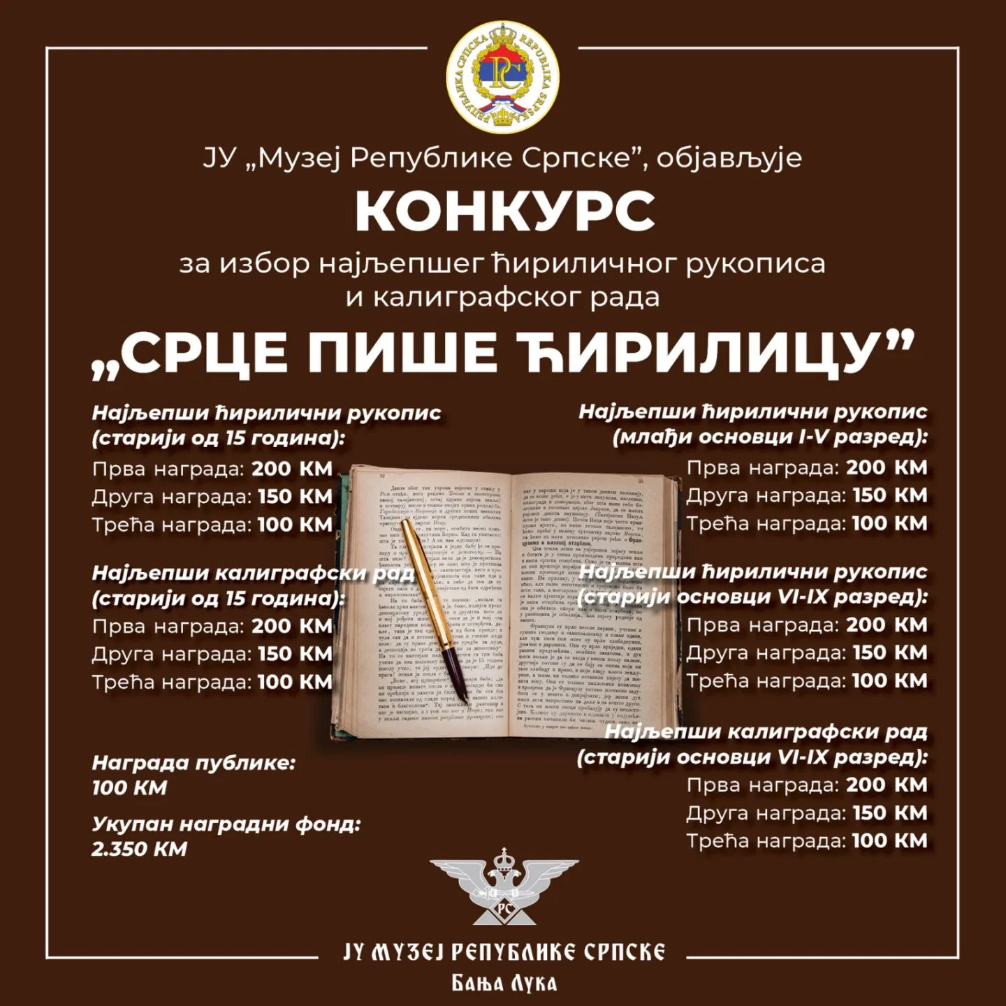 Muzej Republike Srpske raspisao je konkurs za najljepši ćirilični rukopis i najljepši kaligrafski rad sa značajno povećanim nagradnim fondom od 2.250 KM.