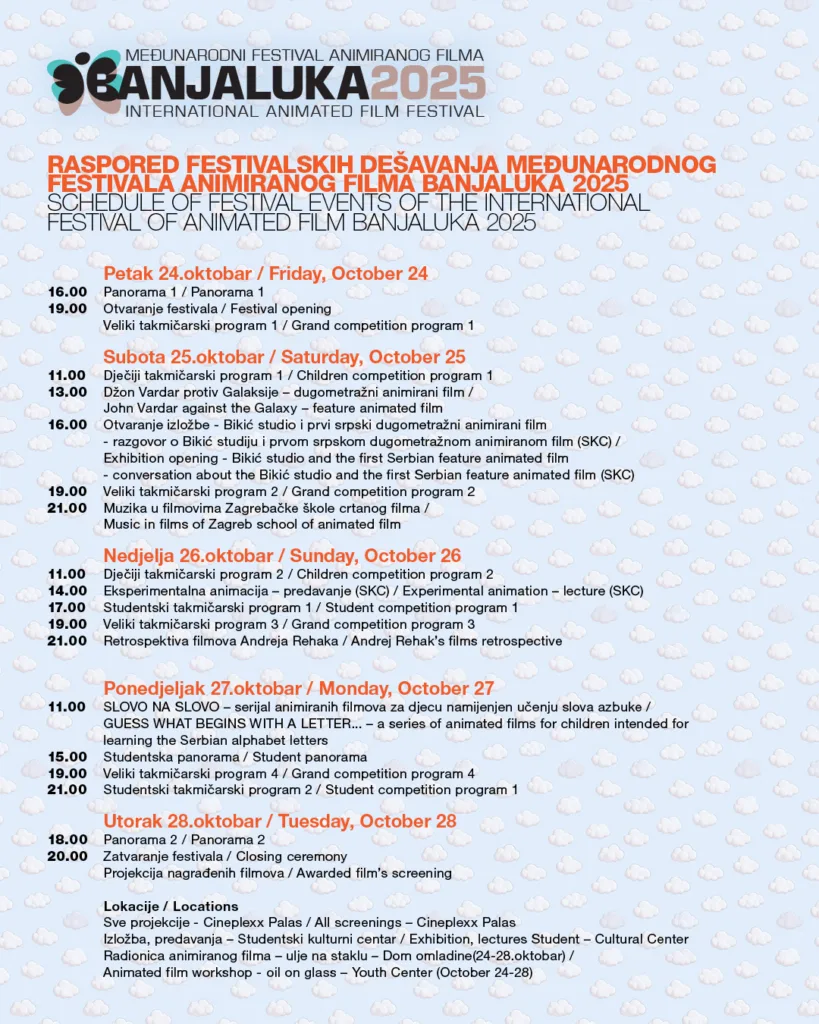 Sve projekcije biće održane u banjalučkom Cineplexx-u „Palas“, dok će dio festivalskih dešavanja biti realizovan u Studentskom kulturnom centru, u krugu Kampusa Univeziteta u Banjaluci.