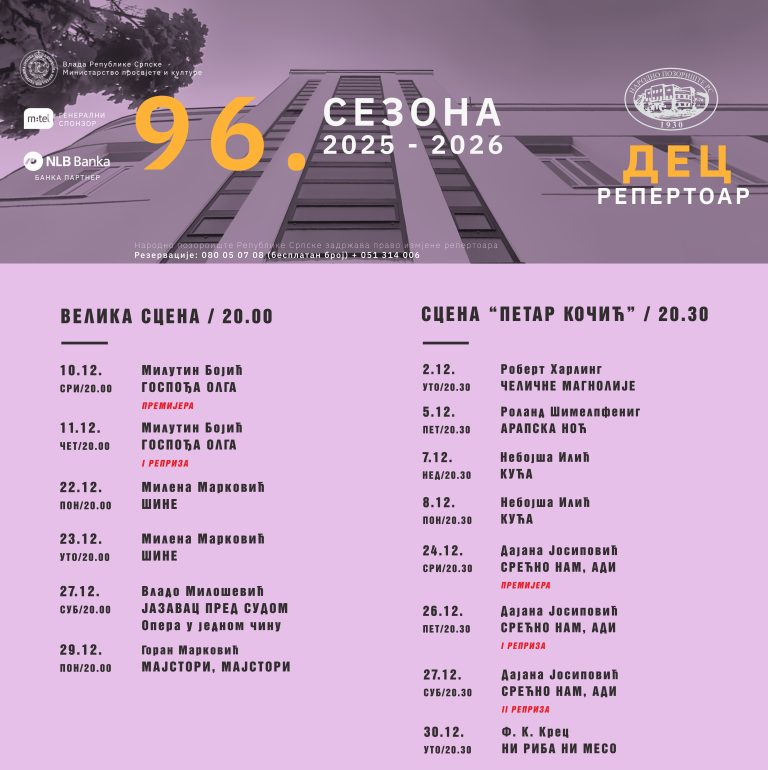 Decembar donosi zanimljiv repertoar u Narodnom pozorištu Republike Srpske.