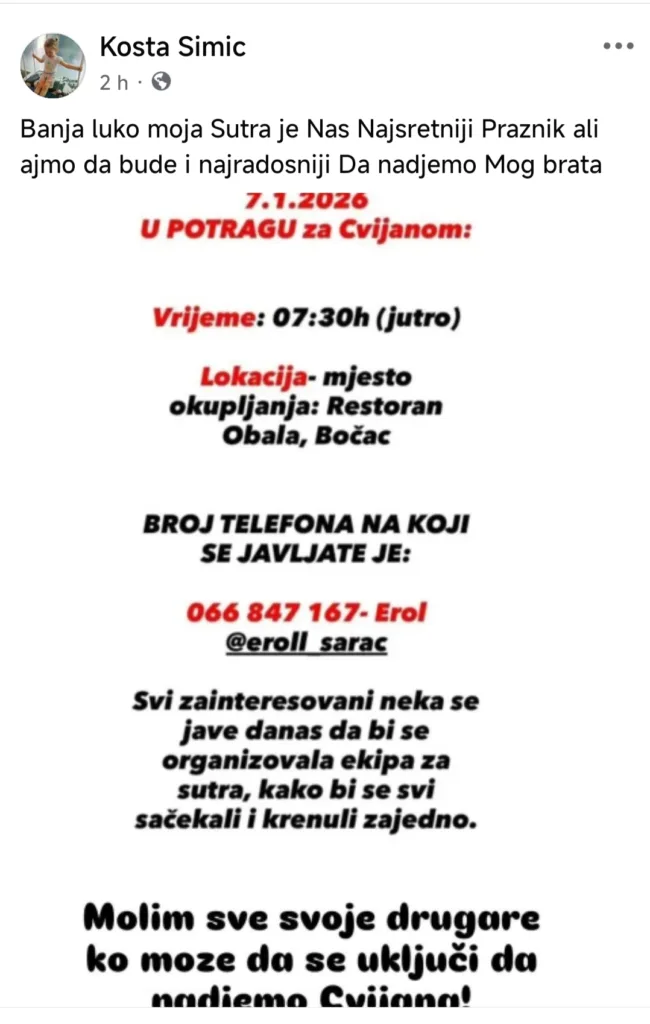 Brat Cvijana Simića koji je posljednji put viđen u petak, 2. januara, pozvao je građane da se sutra uključe u organizovanu potragu, a apel je objavio na društvenim mrežama.