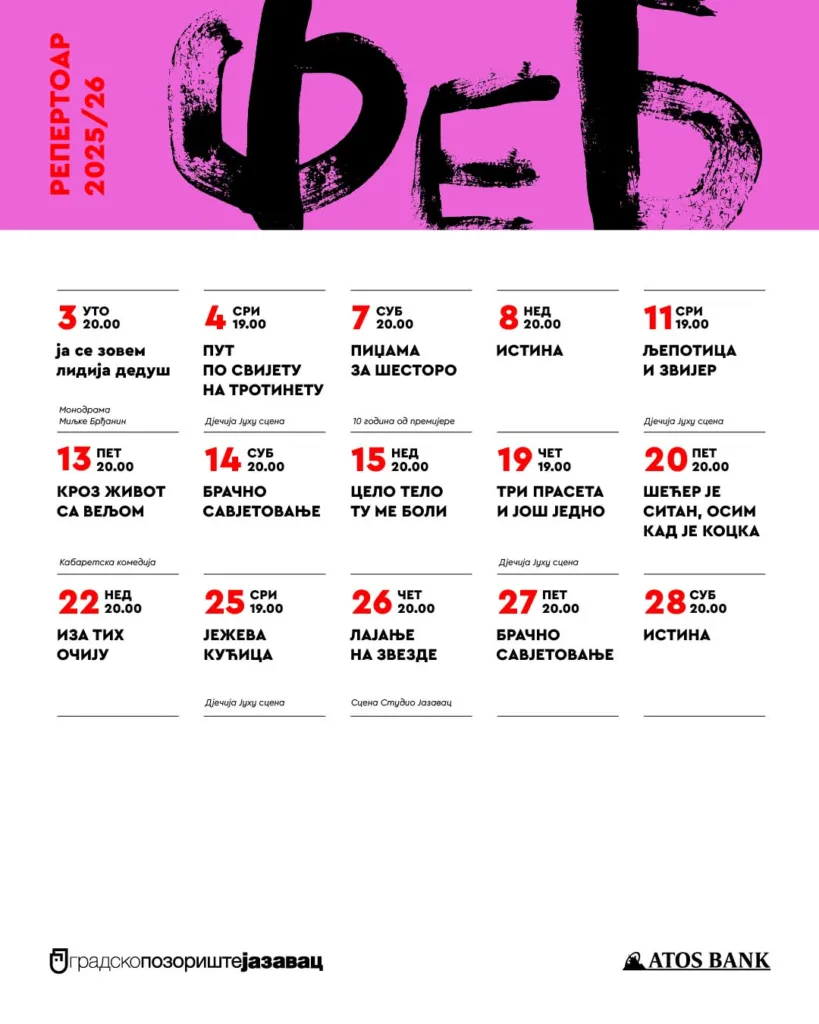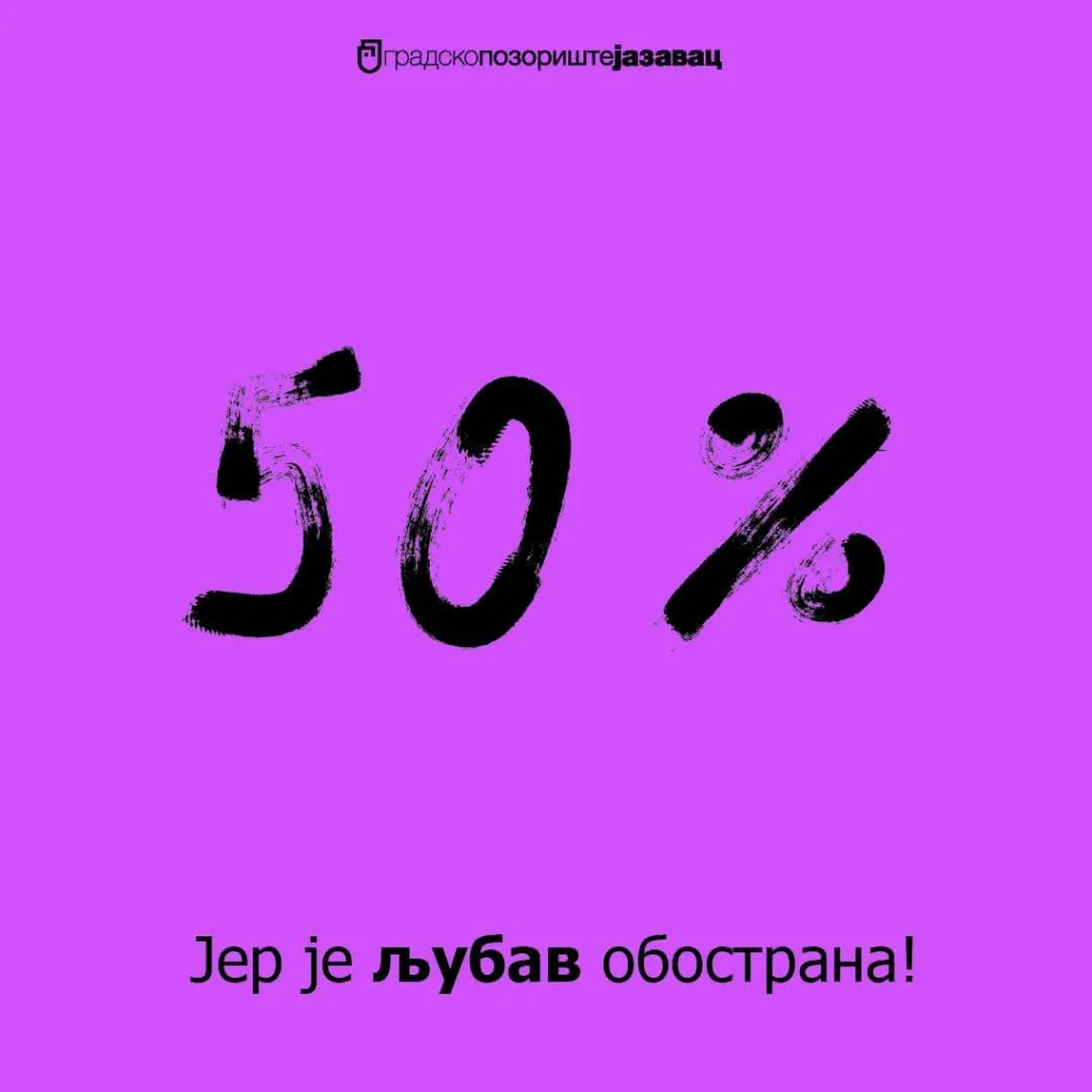 Sve ulaznice za predstave sa februarskog repertoara uz 50% popusta od ponedjeljka, 2.2. do petka, 6.2. možete kupiti na biletarnici Gradskog pozorista Jazavac od 16 do 20 časova, poručuju iz pozorišta i dodaju:
