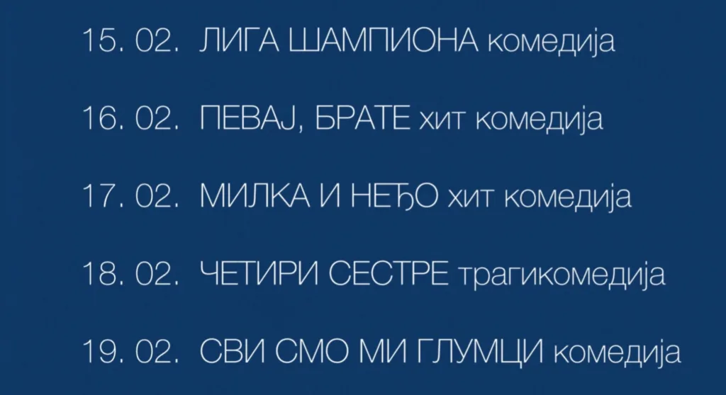 Revija predstava biće održana svako veče od 15. do 19. februara sa početkom u 20 časova i 30 minuta u sljedećem terminima: 15.02. „Liga šampiona“, 16.02. „Pjevaj, brate“, 17.02. „Milka i nebo“, 18.02. „Četiri sestre“ i 19.02. „Svi smo mi glumci“. Cijena ulaznice biće jedinstvena i promotivna i iznosiće 1 KM, kako bismo omogućili što široj publici da bude dio ovog značajnog jubileja.